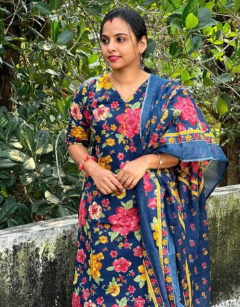 Cotton Floral Printed Slit Kurti With Bottom And Duppatta (Blue)