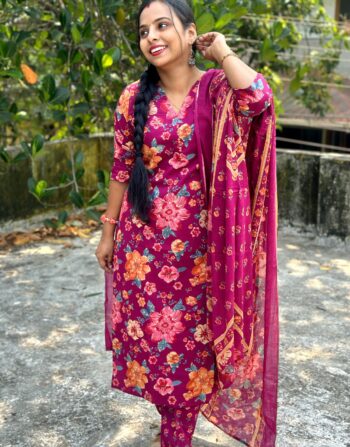 Cotton Floral Printed Slit Kurti With Bottom And Duppatta (Purple)