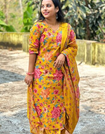 Cotton Floral Printed Slit Kurti With Bottom And Duppatta (Mustard Yellow)
