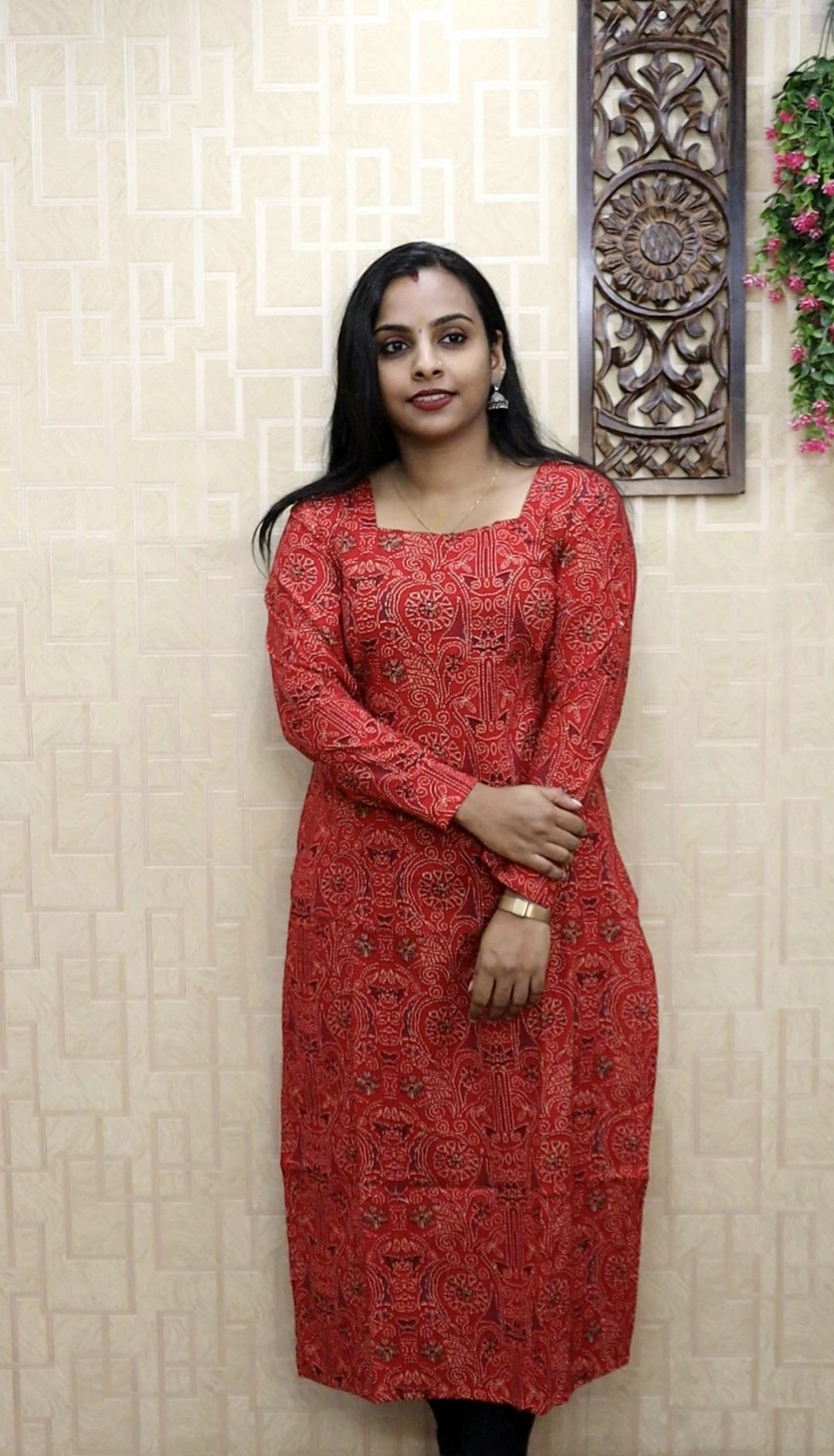 Ajrak Cotton Full Sleeve Slitted Kurti (Red)