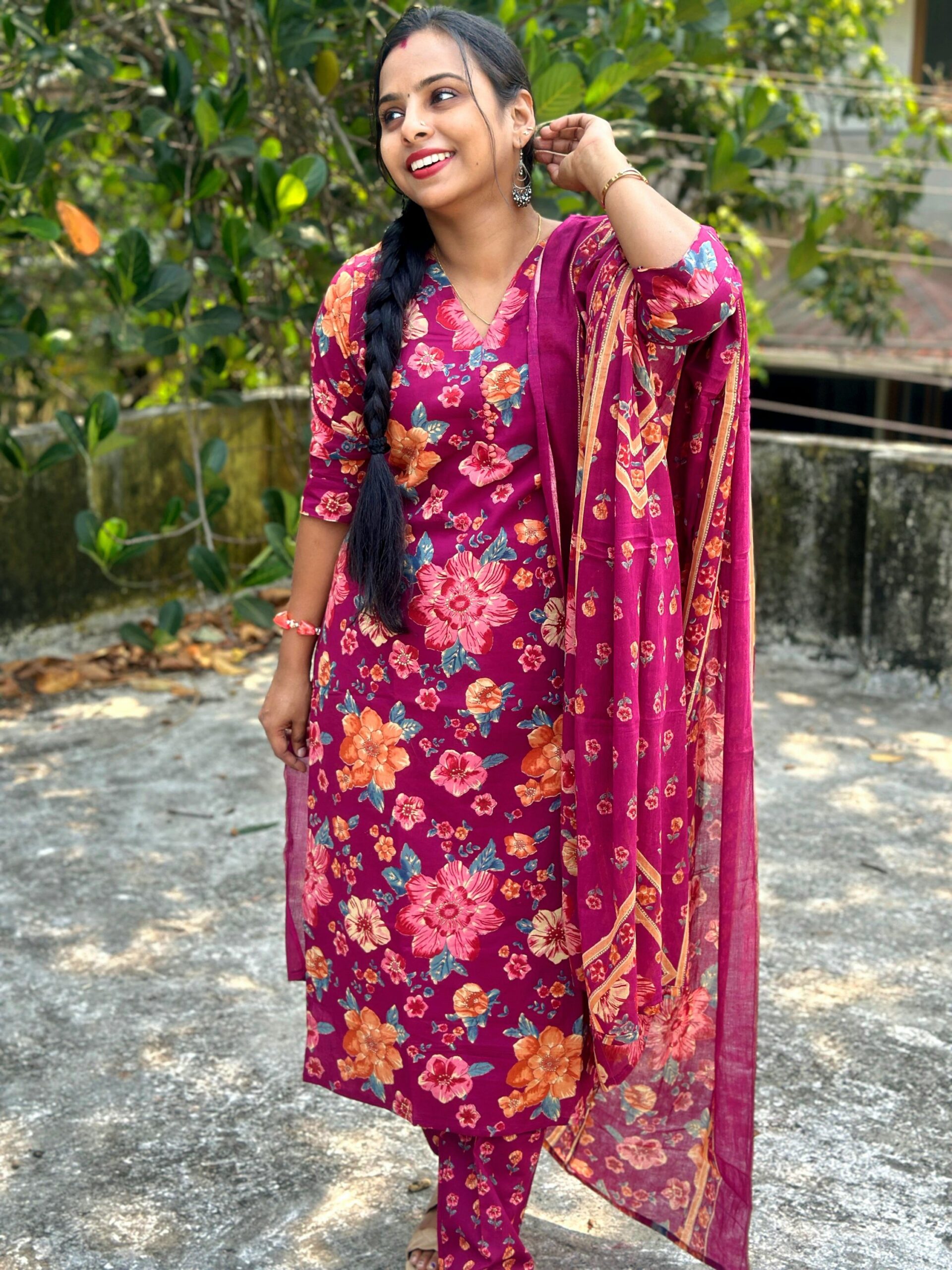 Cotton Floral Printed Slit Kurti With Bottom And Duppatta (Purple)