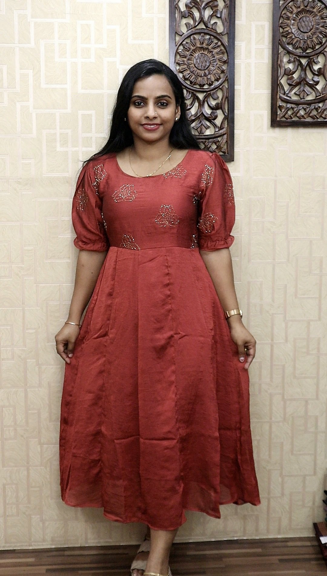 Crushed Vichitra Silk Panel Cut Frock (Brick)