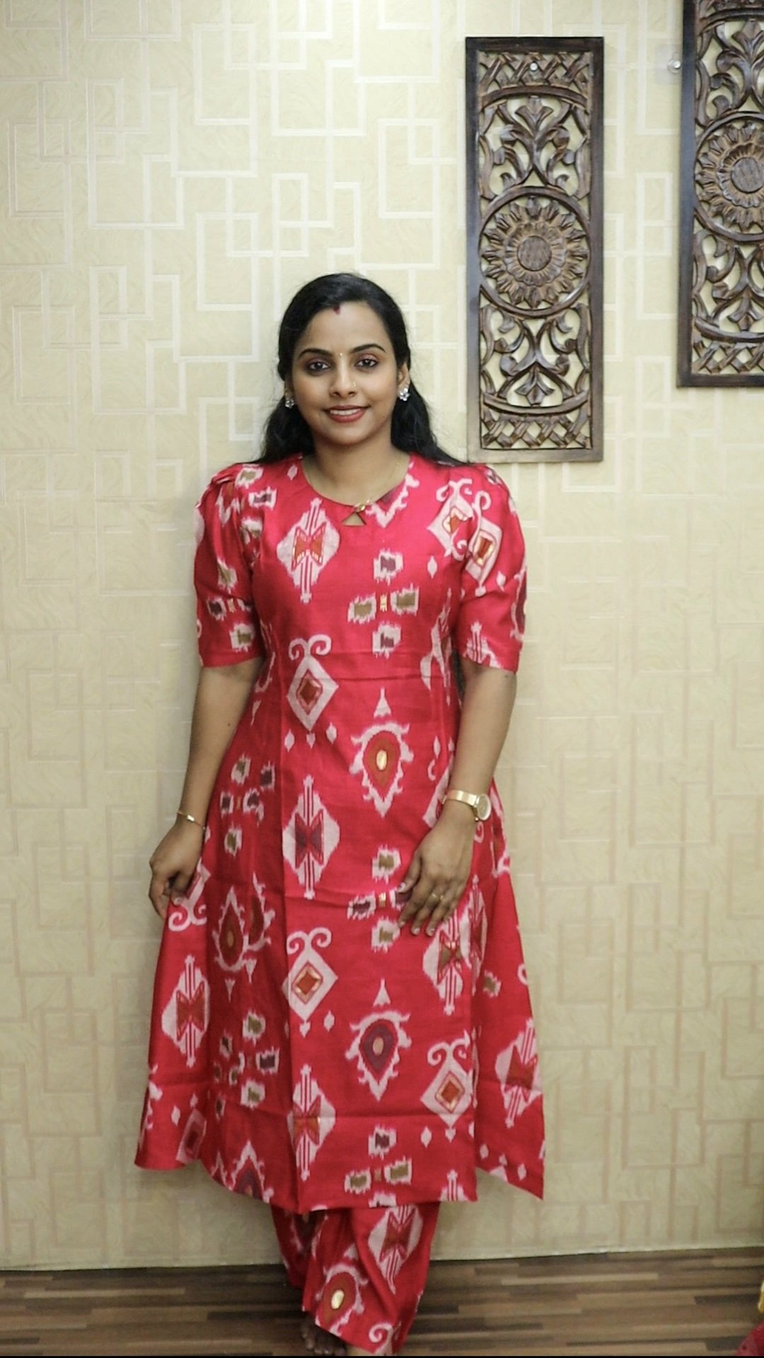Vetican Silk Aline Cord Set With Elbow Puff Sleeves (Pink Ikkat)